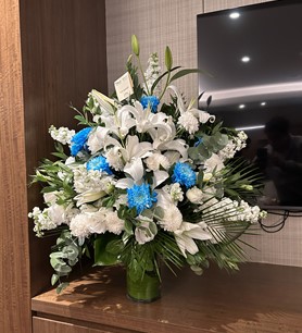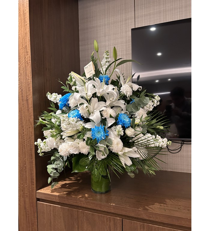 Beyaz zarafetin ve mavi huzurun kusursuz uyumunu yansıtan özel bir aranjmandır. Gösterişli beyaz lilyumlar saflığı ve asaleti simgelerken, canlı mavi krizantemler tasarıma modern ve dikkat çekici bir dokunuş katar. Okaliptus ve zengin yeşil yaprak detaylarıyla hacimli ve ferah bir görünüm sunar.