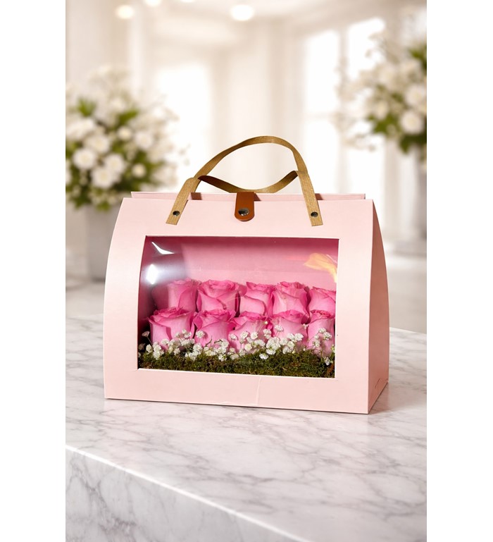 Blush Elegance Rose Box, özel tasarımlı pembe pencereli kutu içerisinde özenle yerleştirilmiş taze pembe güllerden oluşan şık ve zarif bir aranjmandır. Ön kısmındaki şeffaf panel sayesinde güller tüm ihtişamıyla görünürken, doğal cipso ve yeşillik detayları aranjmana romantik bir hava katar. Sevdiklerinize doğum günü, yıldönümü, Sevgililer Günü veya özel anlarda hem modern hem de etkileyici bir hediye alternatifi sunar.