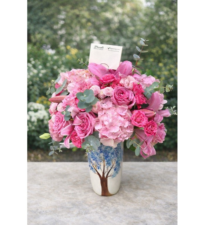 Blush Garden Symphony, yumuşak pembe tonlarının zarif uyumunu yansıtan lüks bir çiçek aranjmanıdır. Premium pembe güller, zarif ortancalar, gösterişli lilyumlar, canlı sprey güller ve dokulu krizantemler; taze okaliptüs yapraklarıyla tamamlanarak romantik ve sofistike bir görünüm sunar. El boyaması seramik vazosu ile birlikte hem şık hem de zamansız bir tasarım oluşturur.
