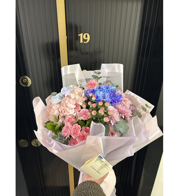 Yumuşak pastel tonların romantik uyumuyla tasarlanmış zarif ve modern bir bukettir. Pembe güller sevgi ve zarafeti temsil ederken, mavi krizantemler tasarıma canlı ve dikkat çekici bir enerji katar. Pudra tonlarındaki ortancalar ve şık detaylar bukete hacim ve sofistike bir görünüm kazandırır.