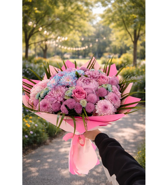 Rosy Whisper Bouquet, pastel pembe ve lila tonlarının yumuşak geçişleriyle romantik bir atmosfer sunan özel tasarım bir bukettir. Zarif pembe güller, dolgun krizantemler ve pastel tonlu ortancalar; modern ambalaj ve doğal yeşil dokunuşlarla tamamlanarak hem şık hem de göz alıcı bir görünüm oluşturur.